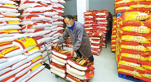 2月18日,四川建國順發(fā)商貿(mào)有限公司工人在搬卸大米。連日來,該公司每天加班加點為各大超市供應(yīng)大米。鐘 敏攝(中經(jīng)視覺)