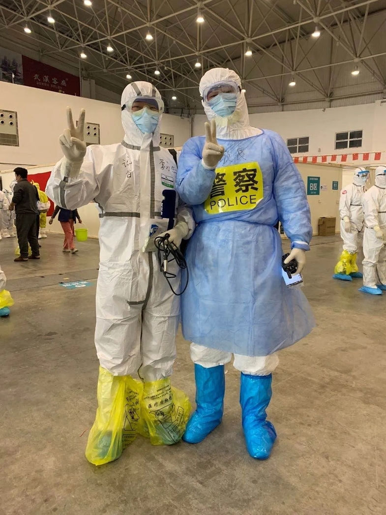 武漢廣播電視臺新聞?lì)l道深度資訊部記者李永杰(左)在武漢客廳方艙醫(yī)院病區(qū)內(nèi)偶遇東西湖區(qū)交通大隊(duì)漢警快騎隊(duì)民警張敬畏。
