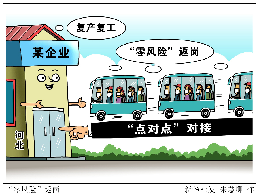 漫畫:“零風(fēng)險(xiǎn)”返崗 為確保務(wù)工人員“零風(fēng)險(xiǎn)”輸出和輸入,河北各地前移疫情防控三道防線,按照“全流程控管、全方位服務(wù)、全天候監(jiān)測”的要求,精準(zhǔn)定向?yàn)槠髽I(yè)輸送務(wù)工人員,滿足企業(yè)復(fù)工復(fù)產(chǎn)和農(nóng)民外出務(wù)工增收的雙重需求。 新華社發(fā) 朱慧卿 作