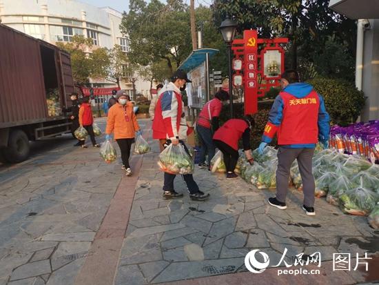 志愿者鄧偉龍?jiān)诰G景苑社區(qū)搬運(yùn)蔬菜。人民網(wǎng)湖北頻道金雨蒙 攝