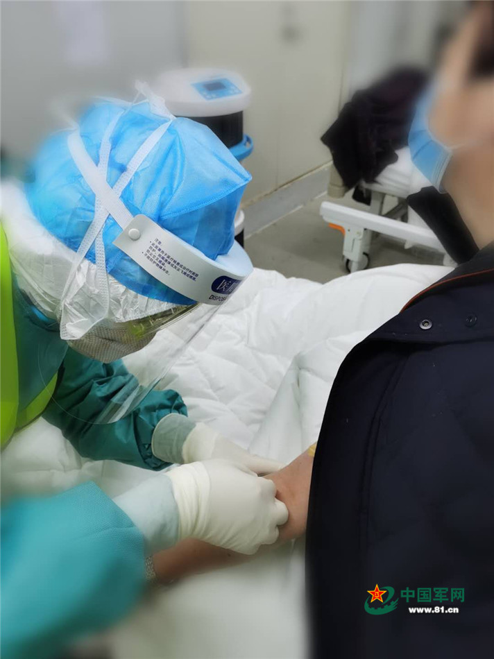 今天的主要任務(wù)是給18名病人抽血。這項(xiàng)平時(shí)對(duì)我來說簡(jiǎn)單的不能再簡(jiǎn)單的任務(wù),此刻卻充滿了挑戰(zhàn)性??谡帧⒚弊?、手套、防護(hù)服、護(hù)目鏡、防護(hù)面屏都給抽血帶來了極大的困難,呼出的熱氣讓護(hù)目鏡變得模糊,昏暗的燈光讓本就有限的視線變得更加不足,三層防護(hù)手套讓抽血也變得毫無手感。在抽血過程中,一個(gè)大媽問道:“姑娘,你們是來自部隊(duì)的么?”我看著她那親切的眼神,笑著點(diǎn)了點(diǎn)頭。大媽露出了信任的微笑,“有你們?cè)冢揖头判牧??!边@句話讓我的內(nèi)心久久不能平靜。