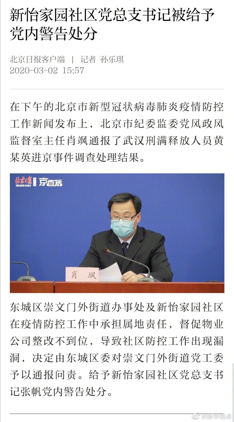 北京新怡家園社區(qū)黨總支書(shū)記被給予黨內(nèi)警告處分-新華網(wǎng)