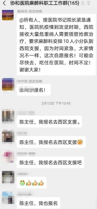 “緊急通知!醫(yī)院抗疫情到攻堅時期,西院接收大量危重病人需要插管搶救治療,要求麻醉科安排10人小分隊到西院支援。時間緊急,大家自愿報名”。這是2月12日上午陳向東在工作群里發(fā)出的醫(yī)院緊急通知。
