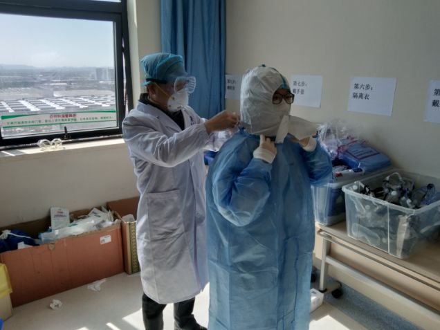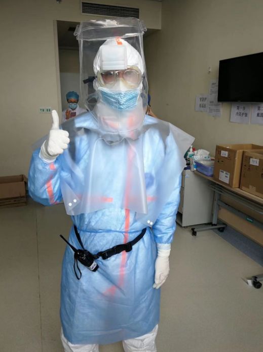 首先是防護(hù)裝備。進(jìn)隔離病房一般是三級防護(hù),除穿戴防護(hù)服、隔離衣、護(hù)目鏡、N95口罩、兩層手套,兩層腳套外,還要戴正壓防護(hù)頭套或一次性全面型防護(hù)頭套。此外,頭套還帶有新風(fēng)過濾系統(tǒng)。整套防護(hù)裝備,凌肯在老師的幫助下,花了半個小時才穿上。穿戴完畢,凌肯整個人都很難受。護(hù)目鏡起霧,頭套風(fēng)機(jī)發(fā)出巨大噪音,還有悶熱,整個人都變得遲鈍。