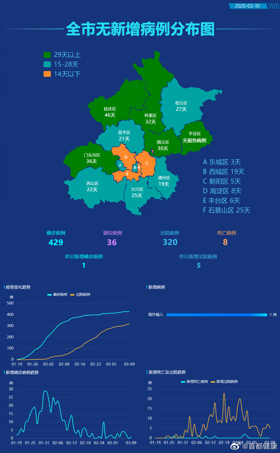 截至3月9日24時(shí),累計(jì)確診病例429例,治愈出院病例320例,死亡病例8例?,F(xiàn)有疑似病例36例。累計(jì)確定密切接觸者3650人,其中467人尚在隔離醫(yī)學(xué)觀察中。確診病例中東城區(qū)14例、西城區(qū)53例、朝陽區(qū)72例、海淀區(qū)63例、豐臺區(qū)43例、石景山區(qū)14例、門頭溝3例、房山區(qū)16例、通州區(qū)19例、順義區(qū)10例、昌平區(qū)29例、大興區(qū)39例、懷柔區(qū)7例、密云區(qū)7例、延慶區(qū)1例,平谷區(qū)尚未有病例,外地來京病例25例,境外輸入病例14例。