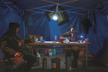 3月12日凌晨,堅(jiān)守在草廠三條北口的保安張俊生(圖右)和張志桓。他們的夜宵是每人一碗方便面加一個(gè)饅頭。