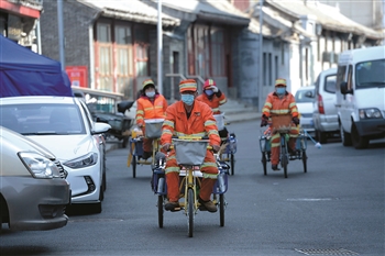 3月11日,前門(mén)街道,環(huán)衛(wèi)工們走街串巷打掃衛(wèi)生。