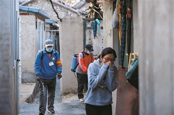 3月12日,任國(guó)慶(圖左)和搭檔來(lái)到前門(mén)大江社區(qū)一院落噴灑消毒液。