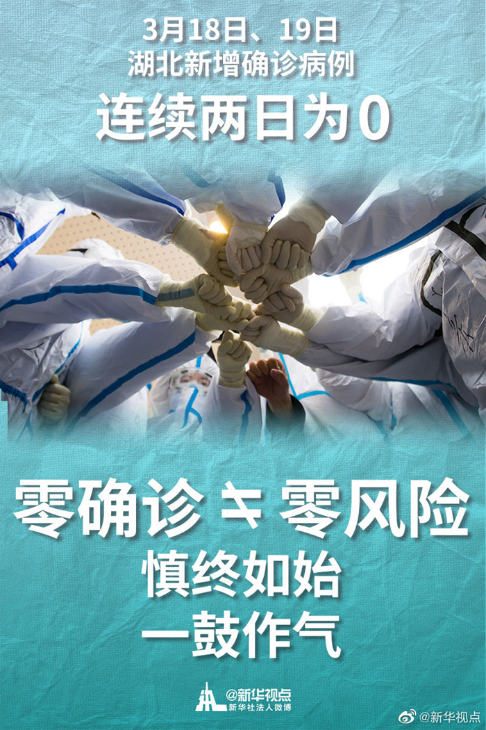 3月18日、19日,湖北連續(xù)兩日無新增確診病例,這是一個令人鼓舞的信號。 同時也要清醒看到國內外疫情形勢的復雜性和嚴峻性。零確診不等于零風險,防疫容不得半點松懈。面對出現的新問題、新挑戰(zhàn),因時因勢精準施策,決不能讓向好形勢發(fā)生逆轉。
