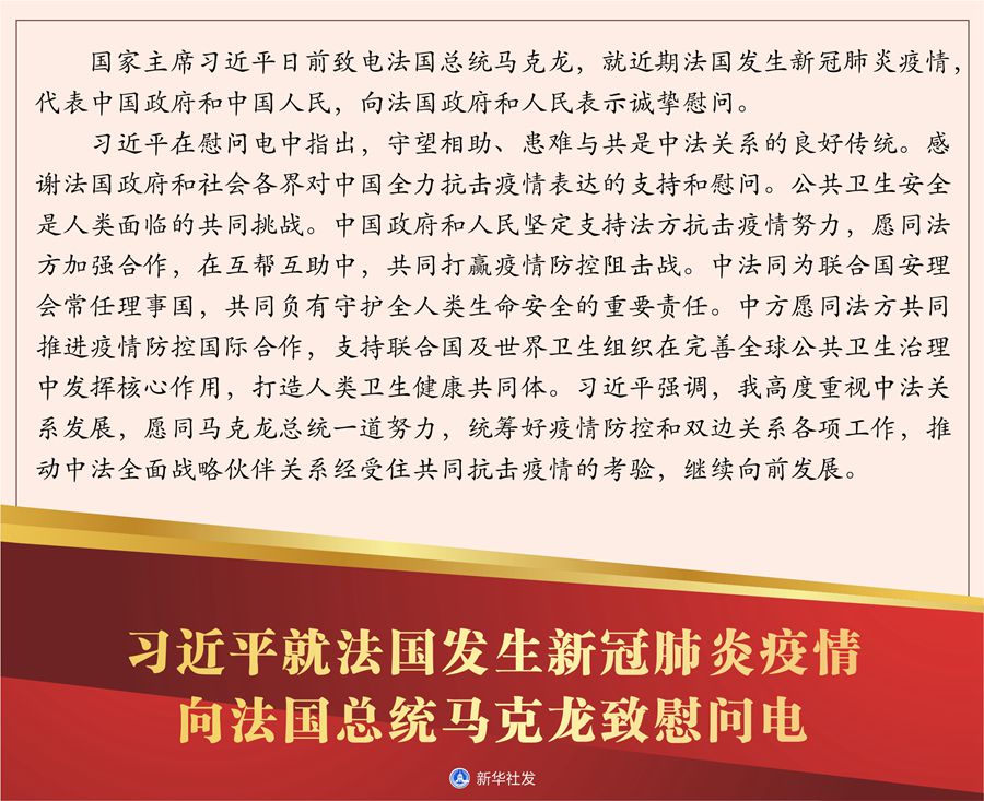 習近平在慰問電中指出,守望相助、患難與共是中法關系的良好傳統(tǒng)。感謝法國政府和社會各界對中國全力抗擊疫情表達的支持和慰問。公共衛(wèi)生安全是人類面臨的共同挑戰(zhàn)。中國政府和人民堅定支持法方抗擊疫情努力,愿同法方加強合作,在互幫互助中,共同打贏疫情防控阻擊戰(zhàn)。中法同為聯(lián)合國安理會常任理事國,共同負有守護全人類生命安全的重要責任。中方愿同法方共同推進疫情防控國際合作,支持聯(lián)合國及世界衛(wèi)生組織在完善全球公共衛(wèi)生治理中發(fā)揮核心作用,打造人類衛(wèi)生健康共同體。習近平強調,我高度重視中法關系發(fā)展,愿同馬克龍總統(tǒng)一道努力,統(tǒng)籌好疫情防控和雙邊關系各項工作,推動中法全面戰(zhàn)略伙伴關系經(jīng)受住共同抗擊疫情的考驗,繼續(xù)向前發(fā)展。