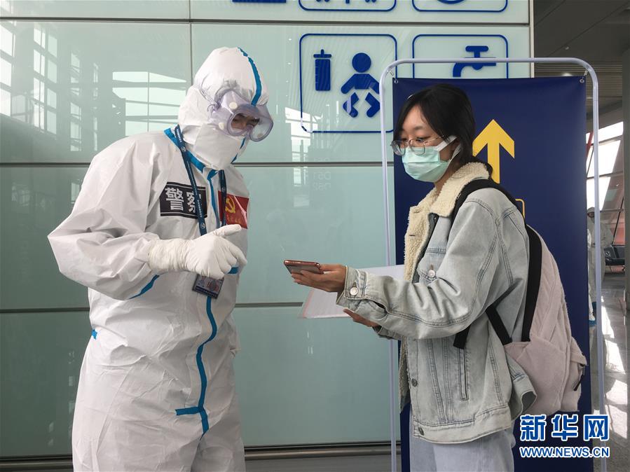 3月18日,首都機(jī)場(chǎng)公安局境外輸入疫情防控突擊隊(duì)副隊(duì)長(zhǎng)路濤(左)在首都機(jī)場(chǎng)T3-D區(qū)幫助旅客解決問題。 新華社發(fā)
