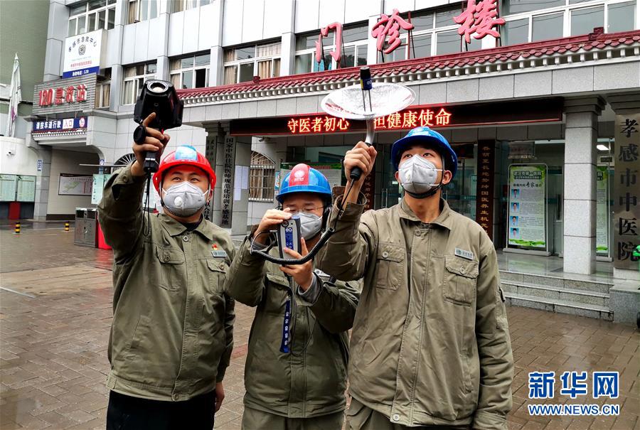 國(guó)網(wǎng)湖北孝感供電公司開發(fā)區(qū)供電中心配電運(yùn)檢班班長(zhǎng)沈剛(左一)用紅外成像儀檢查醫(yī)院專用供電線路(1月24日攝)。 新華社發(fā) (劉剛 攝)