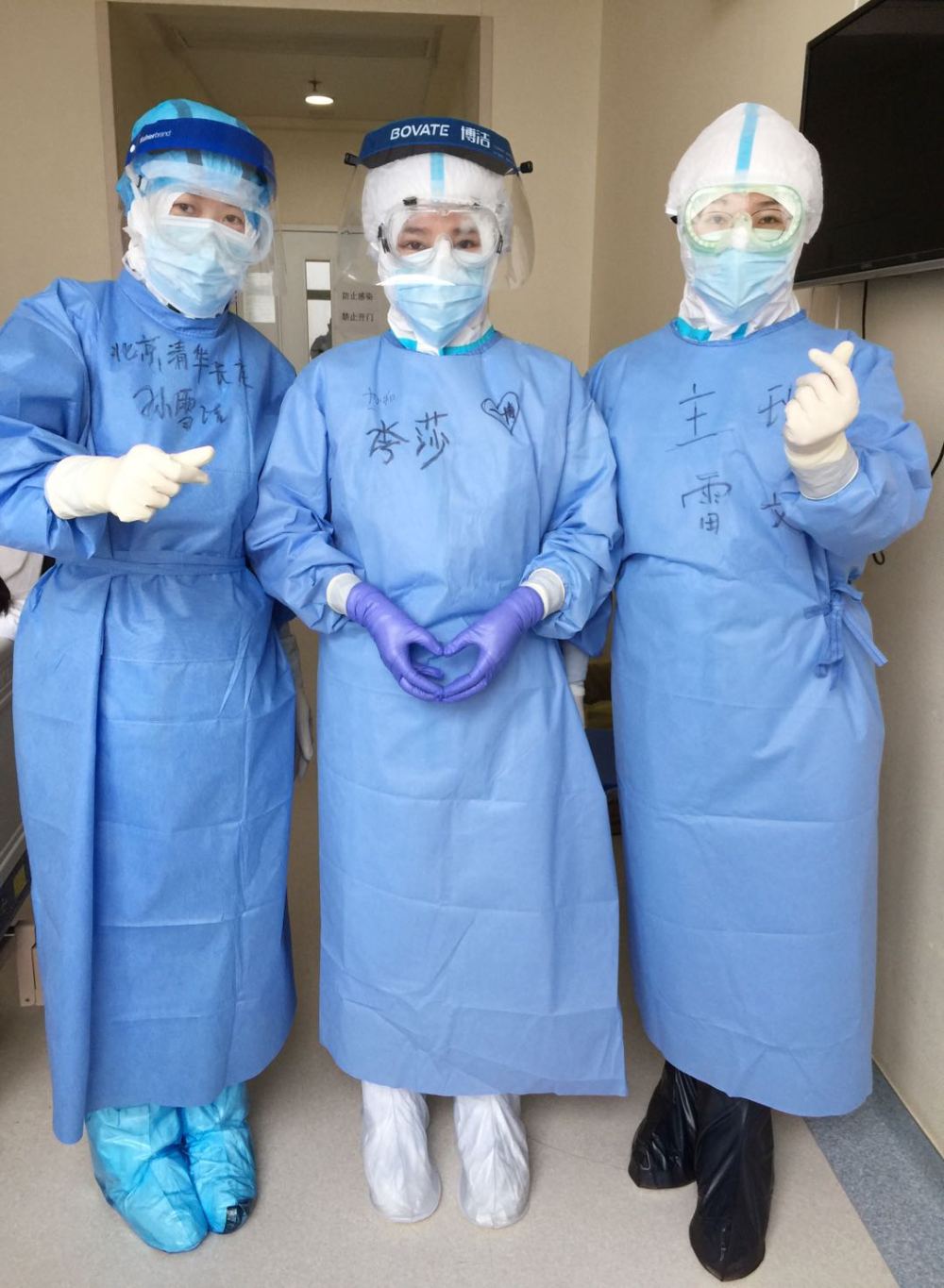 我想了想,有點開玩笑地說:“家人現(xiàn)在都很平安,唯一的心愿是可以見到我最喜歡的偶像王一博?!比缓笸聜兙推鸷逭f要錄下來,并在我的防護服上寫了四個大字“一博等我”。