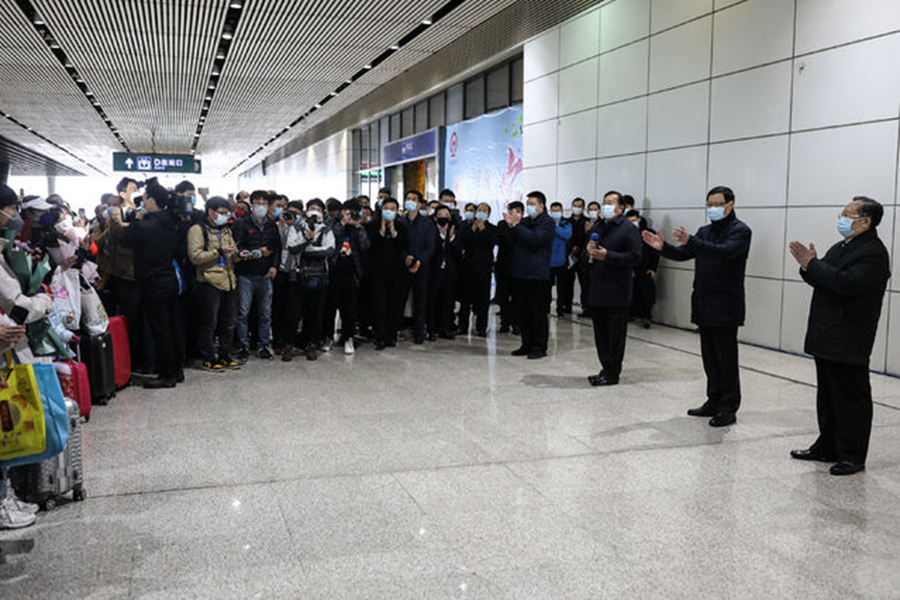 3月28日,武漢火車站,湖北省委書記應(yīng)勇(右二),省委副書記、省長(zhǎng)王曉東(右一)等人迎接從廣州南到武漢的G1112次列車乘客。記者 趙迪/攝