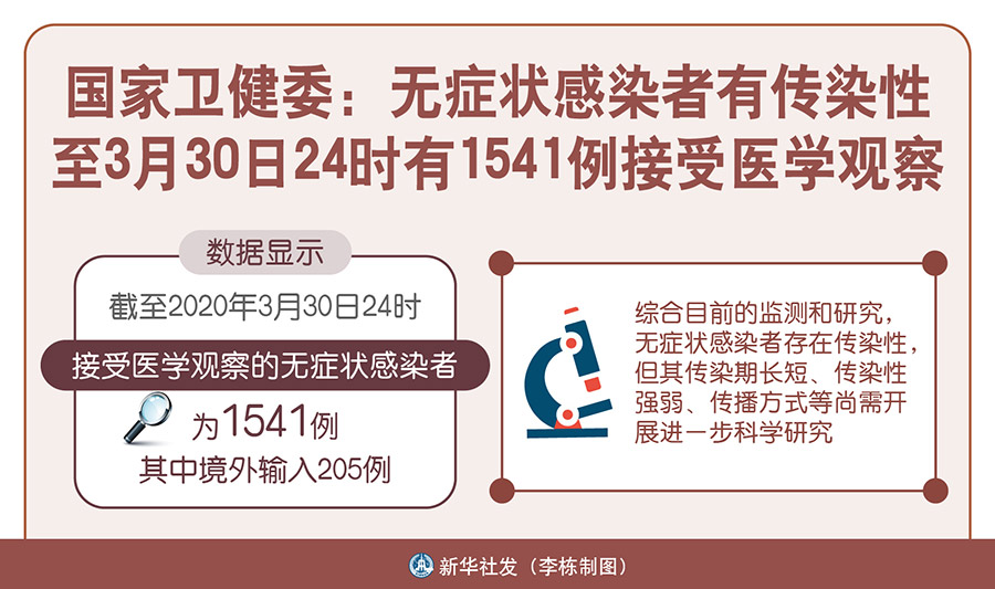 新華社北京3月31日電(記者王秉陽)國家衛(wèi)健委31日在官網(wǎng)發(fā)布《關(guān)于新型冠狀病毒無癥狀感染者的防控工作答問》,對近來網(wǎng)民熱議的無癥狀感染者相關(guān)問題進行回答。數(shù)據(jù)顯示,截至2020年3月30日24時,接受醫(yī)學(xué)觀察的無癥狀感染者為1541例,其中境外輸入205例。