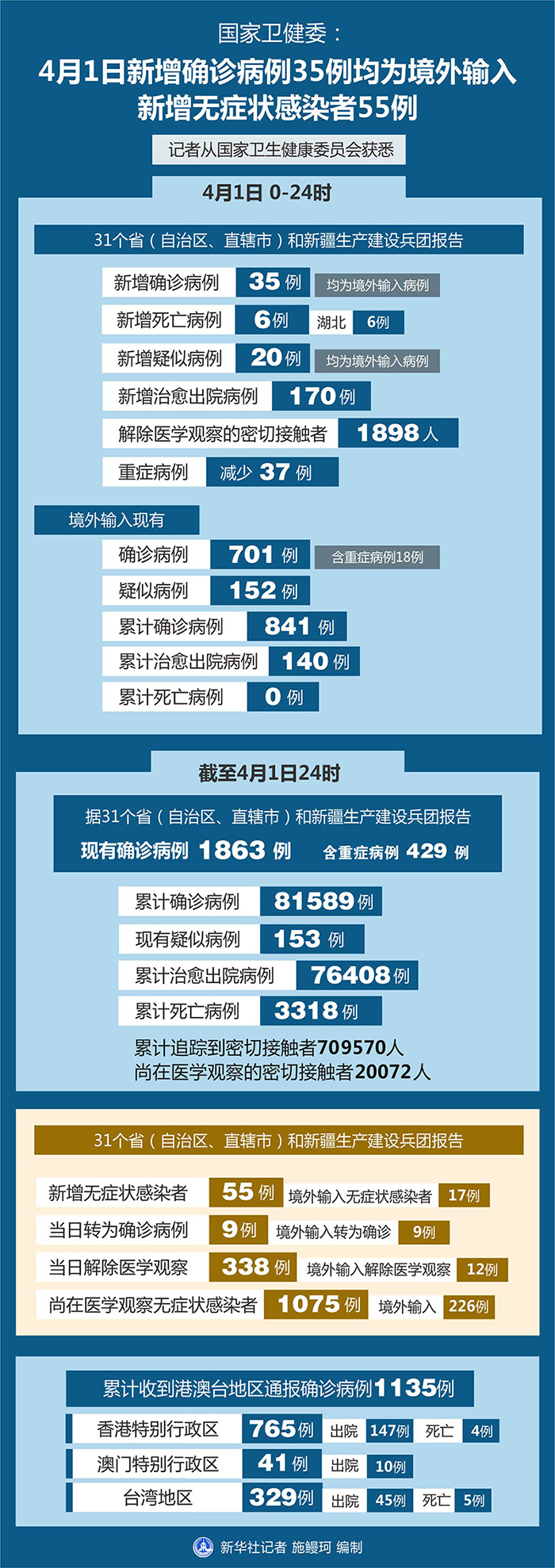 截至4月1日24時(shí),據(jù)31個(gè)?。ㄗ灾螀^(qū)、直轄市)和新疆生產(chǎn)建設(shè)兵團(tuán)報(bào)告,現(xiàn)有確診病例1863例(含重癥病例429例),現(xiàn)有疑似病例153例。累計(jì)確診病例81589例,累計(jì)治愈出院病例76408例,累計(jì)死亡病例3318例,累計(jì)追蹤到密切接觸者709570人,尚在醫(yī)學(xué)觀察的密切接觸者20072人。
