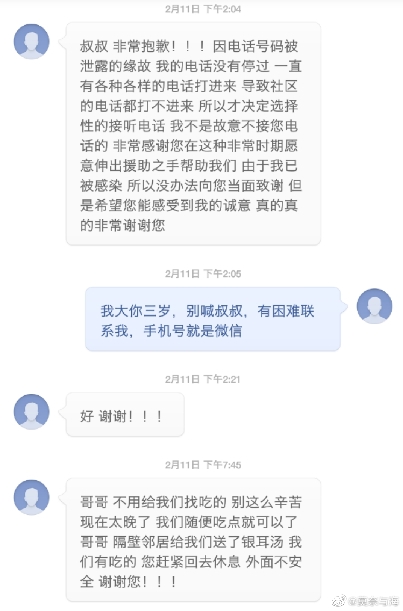 他給一個(gè)老人先后送了三次物資,包括一千多元的藥、一千多元的糧食肉菜,“至少保證他一個(gè)月不用愁”。但老人還是隔三差五打來(lái)電話(huà),說(shuō)缺這個(gè)缺那個(gè)。