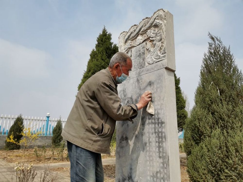 4月2日,苗明文在“八路墳”仔細擦拭烈士碑。新華社記者 杜一方 攝