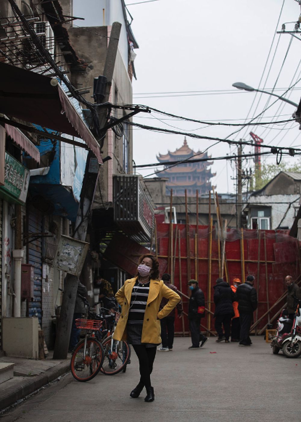 ↑3月15日,一位身穿自制“防護(hù)服”的女士上街買菜時(shí)從黃鶴樓下走過(guò)。她說(shuō)她近兩個(gè)月來(lái),只出過(guò)兩次門。