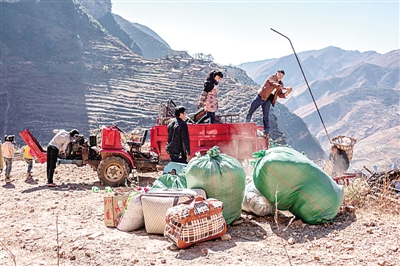 會澤縣易地扶貧搬遷的鄉(xiāng)親們在運(yùn)送行李。