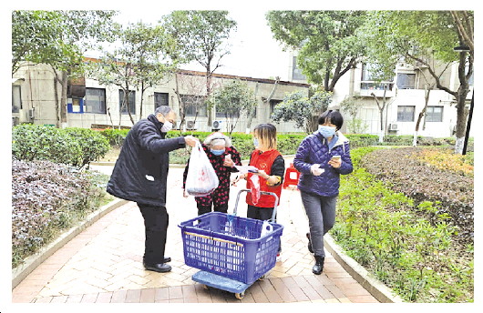 丁倩(左三)為社區(qū)老年人發(fā)放生活物資。
