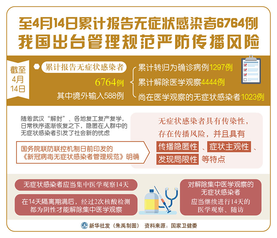 新華社北京4月15日電(記者溫競?cè)A、郁瓊源)記者從國家衛(wèi)健委獲悉,截至4月14日,累計(jì)報(bào)告無癥狀感染者6764例,其中境外輸入588例;累計(jì)轉(zhuǎn)歸為確診病例1297例,累計(jì)解除醫(yī)學(xué)觀察4444例,尚在醫(yī)學(xué)觀察的無癥狀感染者1023例。