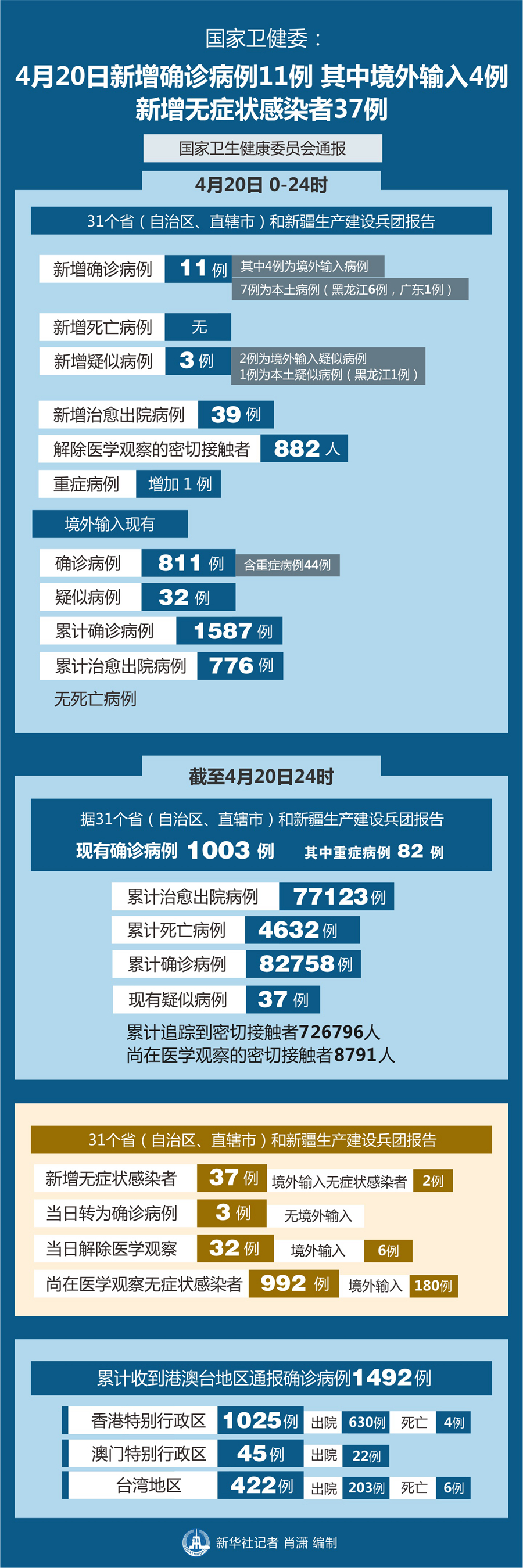 截至4月20日24時(shí),據(jù)31個(gè)?。ㄗ灾螀^(qū)、直轄市)和新疆生產(chǎn)建設(shè)兵團(tuán)報(bào)告,現(xiàn)有確診病例1003例(其中重癥病例82例),累計(jì)治愈出院病例77123例,累計(jì)死亡病例4632例,累計(jì)報(bào)告確診病例82758例,現(xiàn)有疑似病例37例。累計(jì)追蹤到密切接觸者726797人,尚在醫(yī)學(xué)觀察的密切接觸者8791人。