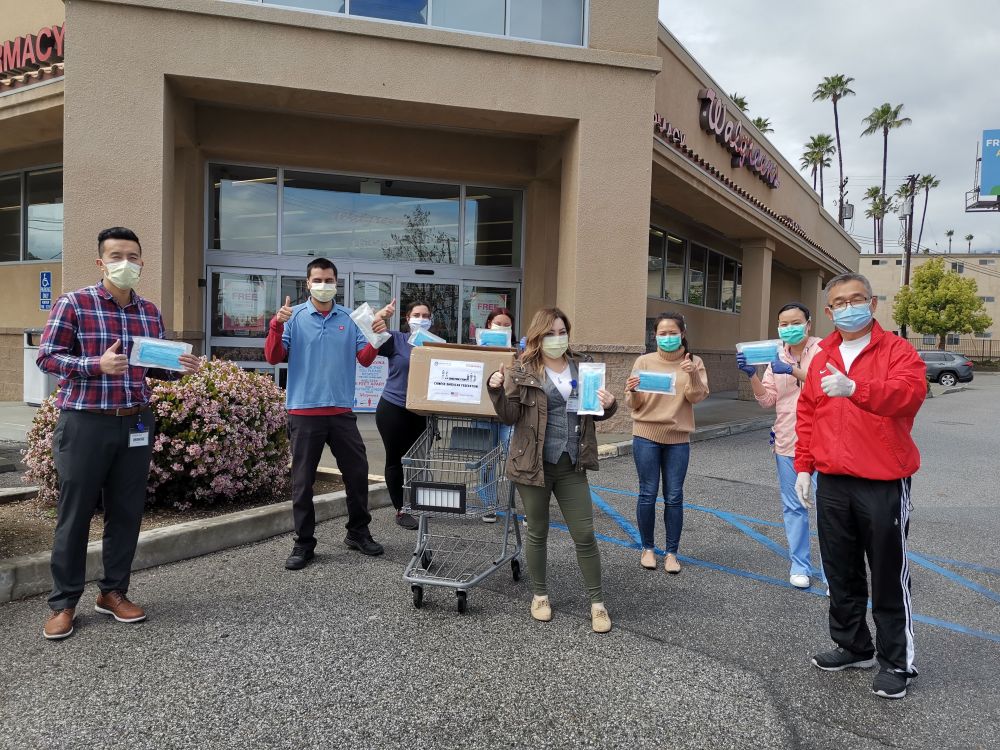 2020年4月7日,在美國洛杉磯縣天普市,美國南加州華人聯(lián)合總會代表向當(dāng)?shù)匾患宜幍昃栀浛谡謺r合影。(新華社發(fā))