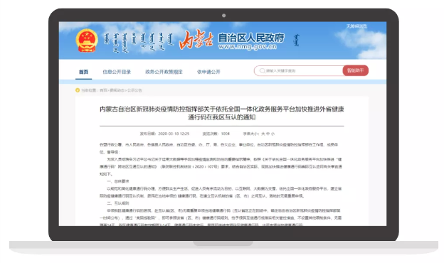 內(nèi)蒙古自治區(qū)以規(guī)范和簡(jiǎn)化健康通行碼辦理、方便群眾生產(chǎn)生活、促進(jìn)人員有序流動(dòng)為目的,以互聯(lián)網(wǎng)、大數(shù)據(jù)為支撐,依托全國(guó)一體化政務(wù)服務(wù)平臺(tái),建立省際防疫健康通行碼互認(rèn)機(jī)制,居民在當(dāng)?shù)厣觐I(lǐng)的健康通行碼,在建立互認(rèn)機(jī)制的?。▍^(qū)、市)之間互認(rèn),出行時(shí)無需重復(fù)申領(lǐng)。