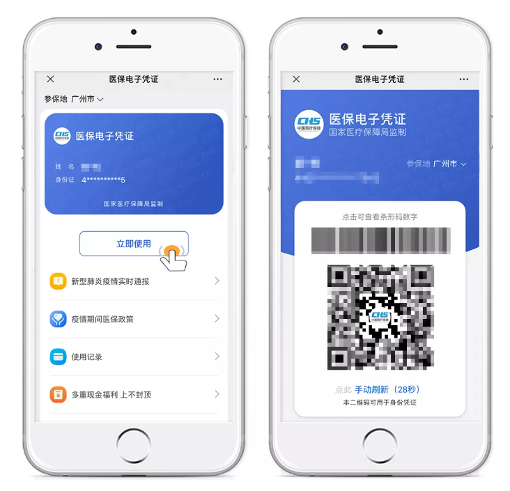 在你需要掛號、支付醫(yī)藥費、入院登記、出院結算、藥店買藥等時候,點擊醫(yī)保電子憑證下方的“立即使用”,將出現(xiàn)的條形碼和二維碼向醫(yī)院或藥店出示,即可“無接觸”完成驗證支付。