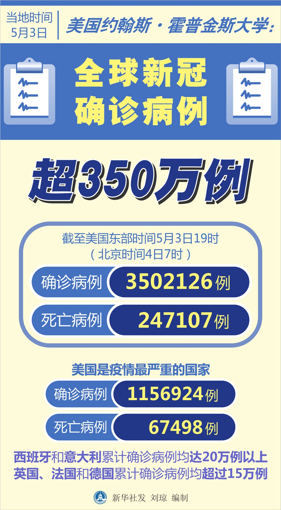 新華社紐約5月3日電 美國約翰斯·霍普金斯大學(xué)3日發(fā)布的新冠疫情最新統(tǒng)計數(shù)據(jù)顯示,全球累計確診病例超過350萬例。