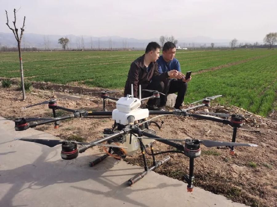 農(nóng)業(yè)托管改變了當?shù)氐霓r(nóng)業(yè)生產(chǎn)方式,山西省翼城縣新翔豐農(nóng)業(yè)科技有限公司植保作業(yè)人員在田間進行除草作業(yè) 李虎威 攝