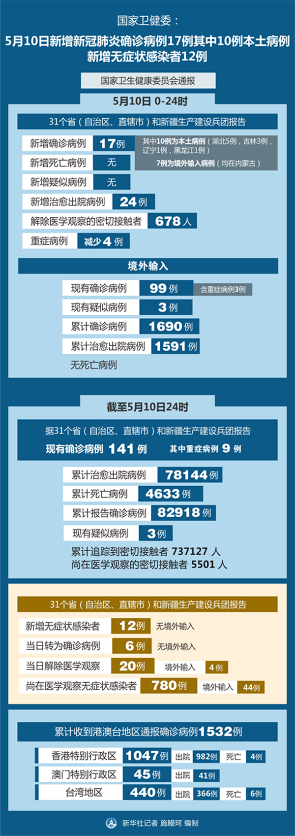 截至5月10日24時(shí),據(jù)31個(gè)?。ㄗ灾螀^(qū)、直轄市)和新疆生產(chǎn)建設(shè)兵團(tuán)報(bào)告,現(xiàn)有確診病例141例(其中重癥病例9例),累計(jì)治愈出院病例78144例,累計(jì)死亡病例4633例,累計(jì)報(bào)告確診病例82918例,現(xiàn)有疑似病例3例。累計(jì)追蹤到密切接觸者737127人,尚在醫(yī)學(xué)觀察的密切接觸者5501人。