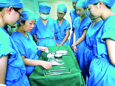 手術的順利進展離不開器械護士的準確傳遞。圖為北京大學護理學院學生正在老師引導下認識手術器械。李珂攝/光明圖片