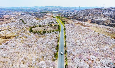 近日,在陜西省榆林市榆陽區(qū)南部山區(qū),漫山遍野杏花盛開,黃土高坡生機(jī)勃勃。新華社發(fā)