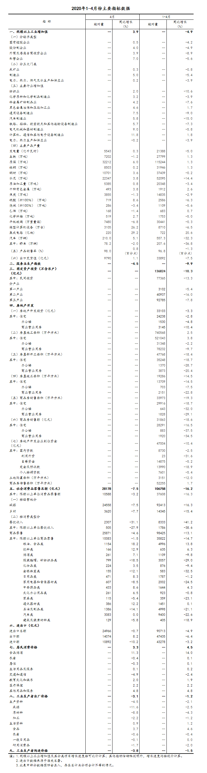 4月份,全國(guó)規(guī)模以上工業(yè)增加值同比增長(zhǎng)3.9%,3月份為下降1.1%;環(huán)比增長(zhǎng)2.27%。1-4月份,全國(guó)規(guī)模以上工業(yè)增加值同比下降4.9%,降幅比1-3月份收窄3.5個(gè)百分點(diǎn)。4月份,分經(jīng)濟(jì)類型看,國(guó)有控股企業(yè)增加值增長(zhǎng)0.5%;股份制企業(yè)增長(zhǎng)4.0%,外商及港澳臺(tái)商投資企業(yè)增長(zhǎng)3.9%;私營(yíng)企業(yè)增長(zhǎng)7.0%。分三大門類看,采礦業(yè)增加值增長(zhǎng)0.3%;制造業(yè)增長(zhǎng)5.0%,3月份為下降1.8%;電力、熱力、燃?xì)饧八a(chǎn)和供應(yīng)業(yè)增長(zhǎng)0.2%。高技術(shù)制造業(yè)和裝備制造業(yè)增長(zhǎng)較快。4月份,高技術(shù)制造業(yè)和裝備制造業(yè)增加值分別增長(zhǎng)10.5%和9.3%,快于規(guī)模以上工業(yè)6.6和5.4個(gè)百分點(diǎn)。從產(chǎn)品產(chǎn)量看,光纜,挖掘、鏟土運(yùn)輸機(jī)械,集成電路,工業(yè)機(jī)器人,微型計(jì)算機(jī)設(shè)備產(chǎn)量同比分別增長(zhǎng)43.8%、40.8%、29.2%、26.6%、26.2%。