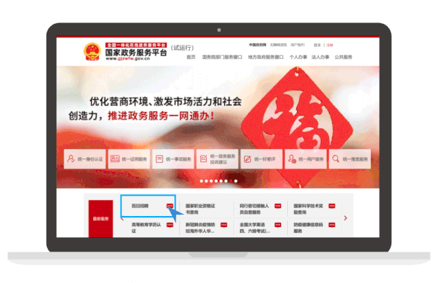 你可以通過電腦使用網(wǎng)頁搜索找到“國家政務(wù)服務(wù)平臺(tái)”后,首頁點(diǎn)擊“百日招聘”進(jìn)入訪問,也可以點(diǎn)擊下方圖片直達(dá)“百日招聘”專題。