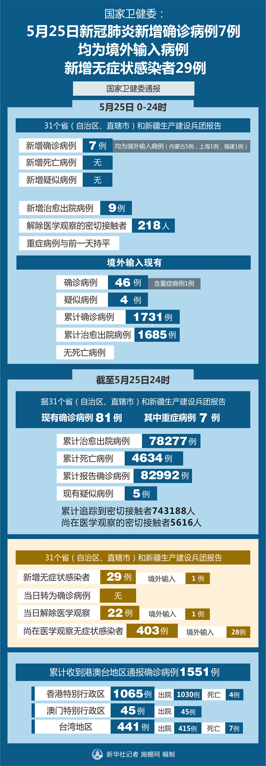截至5月25日24時(shí),據(jù)31個(gè)?。ㄗ灾螀^(qū)、直轄市)和新疆生產(chǎn)建設(shè)兵團(tuán)報(bào)告,現(xiàn)有確診病例81例(其中重癥病例7例),累計(jì)治愈出院病例78277例,累計(jì)死亡病例4634例,累計(jì)報(bào)告確診病例82992例,現(xiàn)有疑似病例5例。累計(jì)追蹤到密切接觸者743188人,尚在醫(yī)學(xué)觀察的密切接觸者5616人。