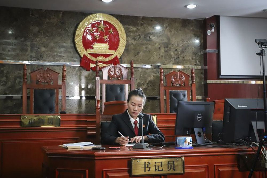↑李金蓮在迪慶州中級人民法院法庭上準(zhǔn)備開庭工作(5月7日攝)。新華社發(fā)(肖竹尹攝)