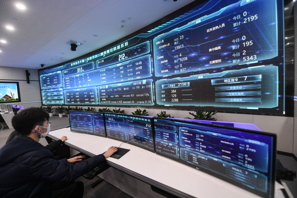 4月2日,在杭州市余杭區(qū)疫情防控工作領(lǐng)導小組指揮部內(nèi),杭州城市大腦精密智控防疫系統(tǒng)顯示疫情防控動態(tài)各項實時數(shù)據(jù)。新華社記者 徐昱 攝