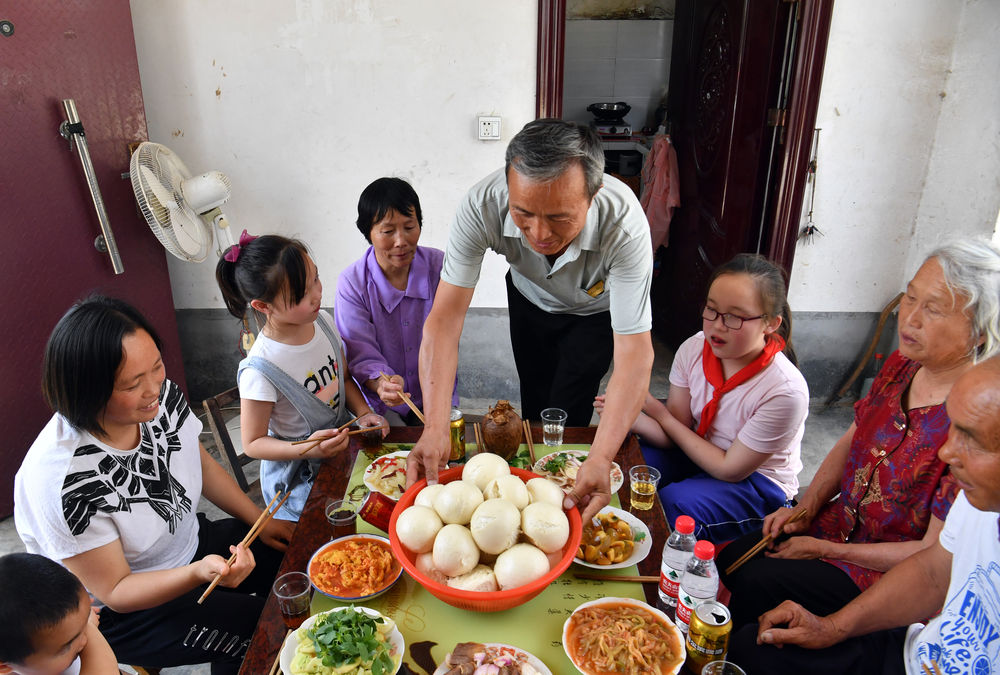 在河南省新蔡縣獅子口村,村民時(shí)中龍一家在吃午飯(5月28日攝)。新華社記者 李嘉南 攝
