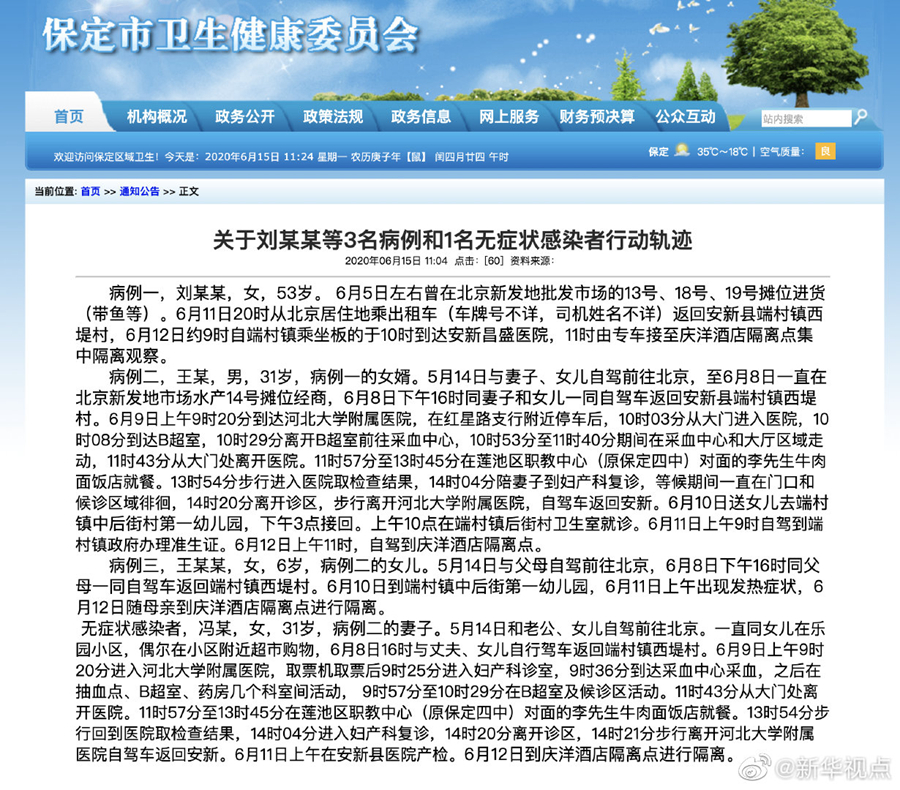 病例一,劉某某,女,53歲。6月5日左右曾在北京新發(fā)地批發(fā)市場的13號、18號、19號攤位進(jìn)貨(帶魚等)。6月11日20時(shí)從北京居住地乘出租車(車牌號不詳,司機(jī)姓名不詳)返回安新縣端村鎮(zhèn)西堤村,6月12日約9時(shí)自端村鎮(zhèn)乘坐板的于10時(shí)到達(dá)安新昌盛醫(yī)院,11時(shí)由專車接至慶洋酒店隔離點(diǎn)集中隔離觀察。