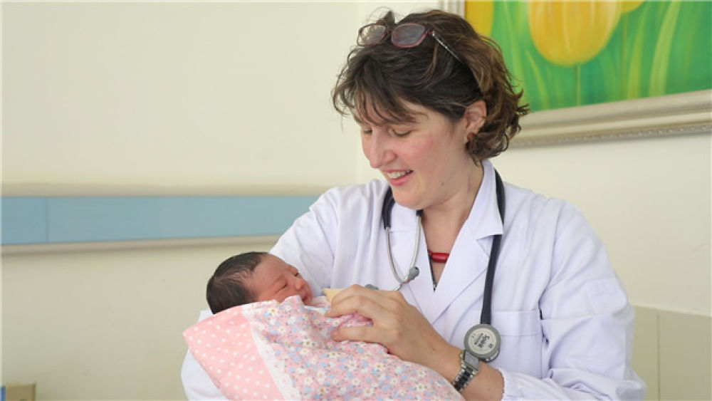鞠瑞欣在青海紅十字醫(yī)院病房?jī)?nèi)為一名新生兒做檢查(2019年10月18日攝)。新華社記者 趙玉和 攝