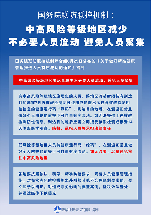 新華社北京6月25日電(記者王秉陽)國務(wù)院聯(lián)防聯(lián)控機(jī)制綜合組25日公布的《關(guān)于做好精準(zhǔn)健康管理推進(jìn)人員有序流動的通知》提到,中高風(fēng)險(xiǎn)等級地區(qū)要盡量減少不必要人員流動,避免人員聚集。