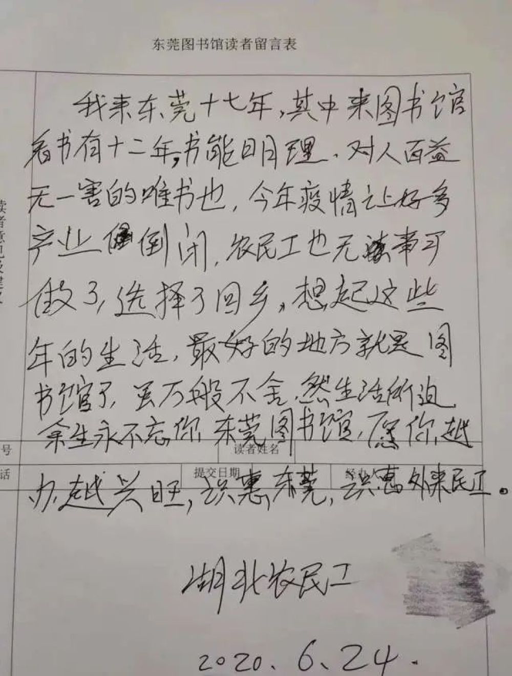 “我來(lái)東莞十七年,其中來(lái)圖書館看書有十二年。書能明理,對(duì)人百益無(wú)一害的唯書也。今年疫情讓好多產(chǎn)業(yè)(企業(yè))倒閉,農(nóng)民工也無(wú)事可做了,選擇了回鄉(xiāng)。想起這些年的生活,最好的地方就是圖書館了。雖萬(wàn)般不舍,然生活所迫,余生永不忘你,東莞圖書館,愿你越辦越興旺。識(shí)惠東莞,識(shí)惠外來(lái)農(nóng)民工。”