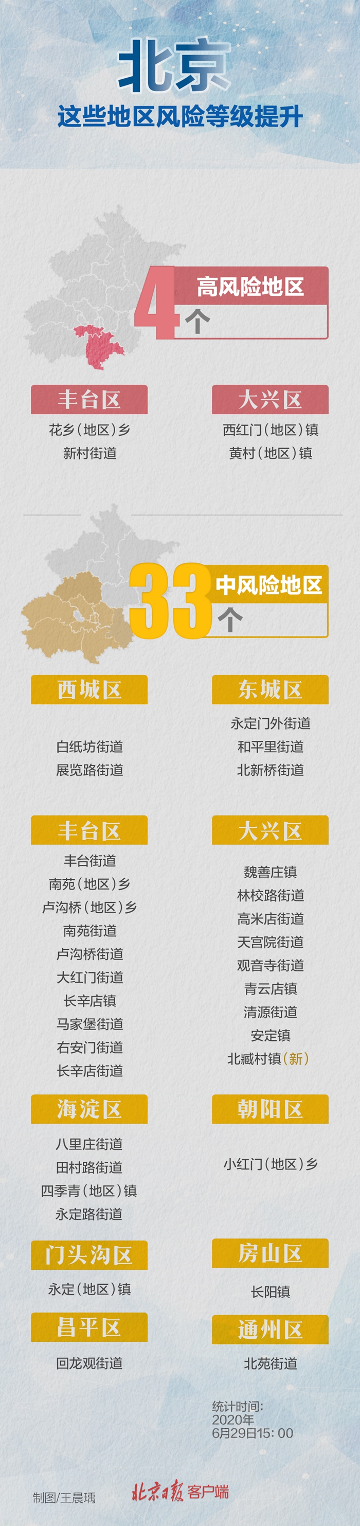 截至目前,本市已有33個(gè)中風(fēng)險(xiǎn)地區(qū),涉及豐臺(tái)區(qū)、大興區(qū)、海淀區(qū)、西城區(qū)、房山區(qū)、東城區(qū)、朝陽區(qū)、門頭溝區(qū)、通州區(qū)、昌平區(qū)10個(gè)區(qū)。另有4個(gè)高風(fēng)險(xiǎn)地區(qū),分別位于豐臺(tái)區(qū)、大興區(qū)。