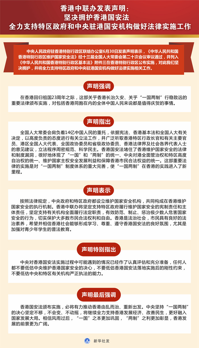 新華社香港6月30日電? 中央人民政府駐香港特別行政區(qū)聯(lián)絡(luò)辦公室30日發(fā)表聲明表示,《中華人民共和國香港特別行政區(qū)維護國家安全法》經(jīng)十三屆全國人大常委會第二十次會議審議通過,并列入《中華人民共和國香港特別行政區(qū)基本法》附件三在香港特別行政區(qū)公布實施,對此我們堅決擁護,并將全力支持特區(qū)政府和中央駐港國安機構(gòu)做好法律實施相關(guān)工作。
