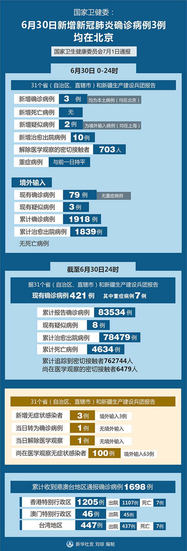 截至6月30日24時(shí),據(jù)31個(gè)?。ㄗ灾螀^(qū)、直轄市)和新疆生產(chǎn)建設(shè)兵團(tuán)報(bào)告,現(xiàn)有確診病例421例(其中重癥病例7例),累計(jì)治愈出院病例78479例,累計(jì)死亡病例4634例,累計(jì)報(bào)告確診病例83534例,現(xiàn)有疑似病例8例。累計(jì)追蹤到密切接觸者762744人,尚在醫(yī)學(xué)觀察的密切接觸者6479人。