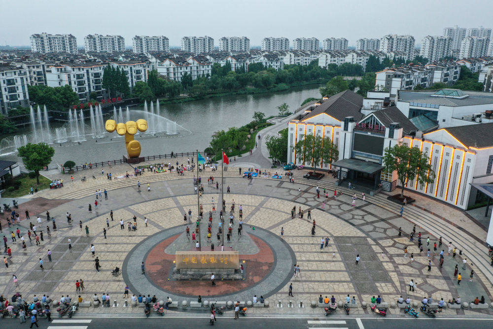 6月19日,居民在江蘇張家港永聯(lián)村的廣場(chǎng)跳舞(無人機(jī)照片)。新華社記者 楊磊 攝