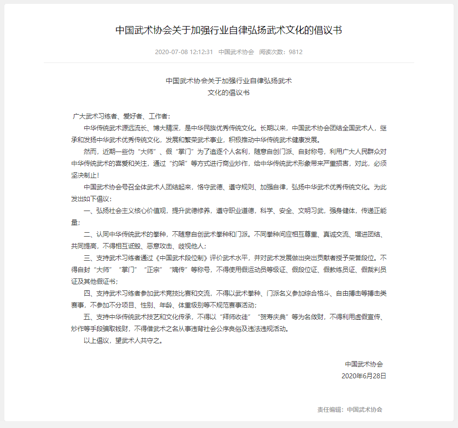 中國武術(shù)協(xié)會在其網(wǎng)站發(fā)布《關(guān)于加強行業(yè)自律弘揚武術(shù)文化的倡議書》,號召全體武術(shù)人團結(jié)起來,恪守武德、遵守規(guī)則、加強自律,弘揚中華武術(shù)優(yōu)秀傳統(tǒng)文化,并倡議武術(shù)習(xí)練者不得自封“大師”“掌門”“正宗”“嫡傳”等稱號,不得以武術(shù)拳種、門派名義參加綜合格斗、自由搏擊等搏擊類賽事,不參加不分項目、性別、年齡、體重級別等不規(guī)范賽事活動。